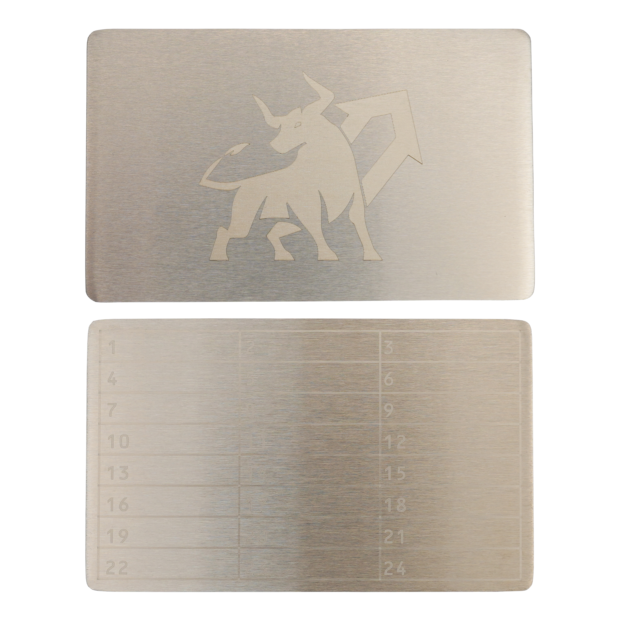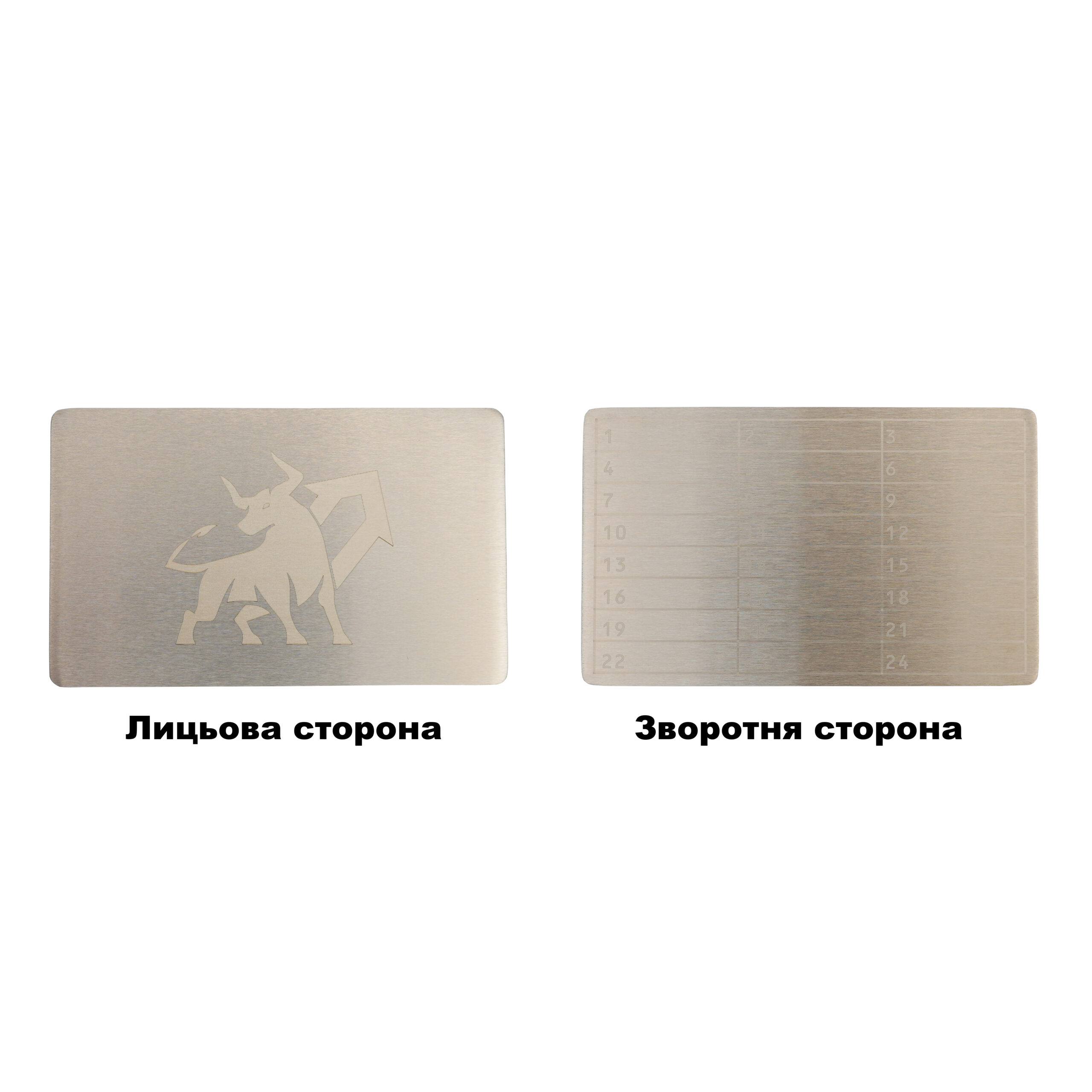 - 1× сталева пластини з лазерно гравійованою сіткою (для 24 слів seed-фрази, розмір: 55 x 90мм).
