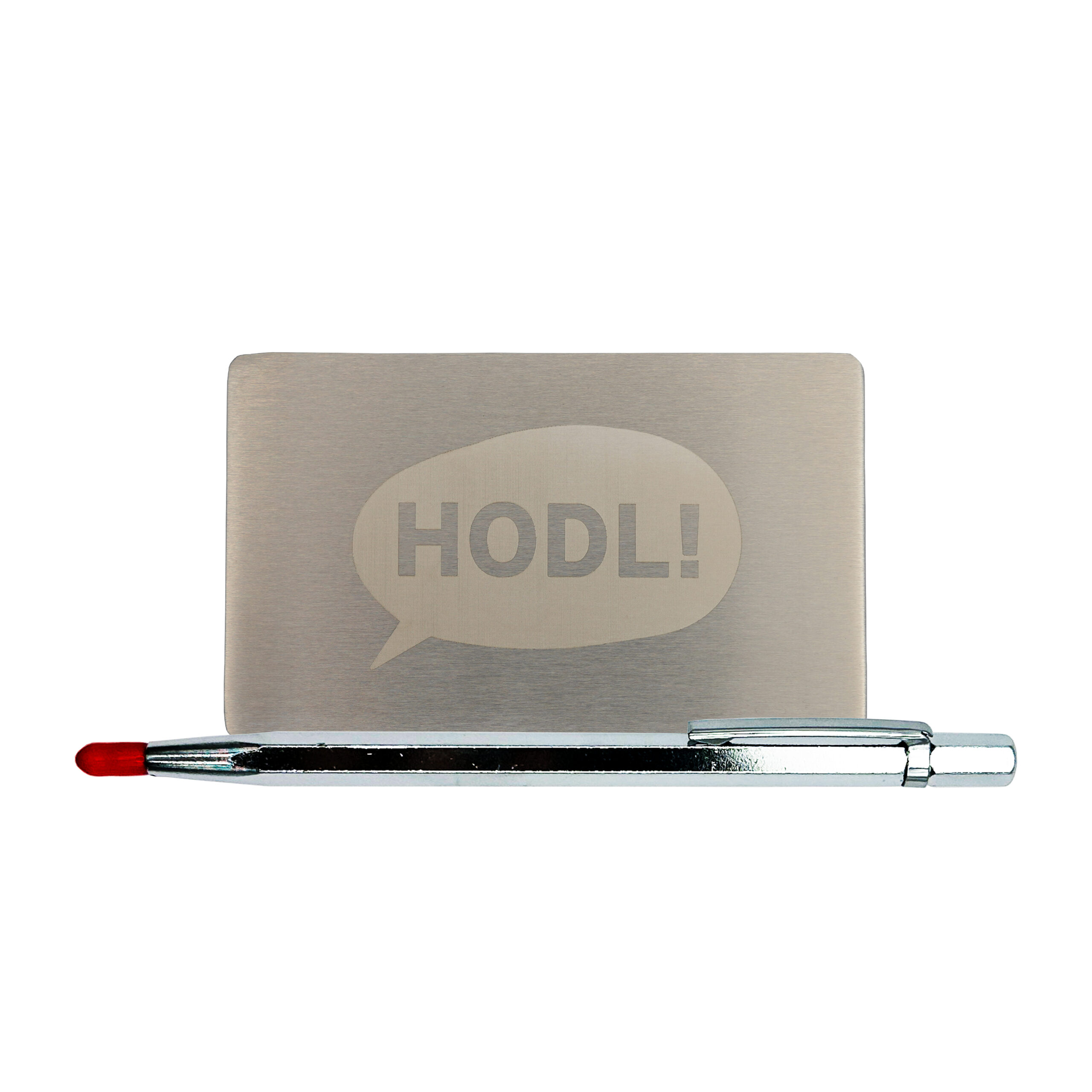- 1× сталева пластини з лазерно гравійованою сіткою (для 24 слів seed-фрази, розмір: 55 x 90мм).